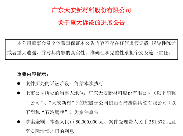 10月22日,广东天安新材料股份有限公司(下称“天安新材”)发布公告,其控股子公司佛山石湾鹰牌陶瓷有限公司与恒大地产集团郑州有限公司的5000万元借款纠纷案,经佛山市禅城区人民法院裁定终结本次执行程序。法院给出的理由是“未发现被执行人有可供执行的财产”。这笔涉及本金5000万元、案件受理费35万余元及相应利息的债权,在历经起诉、胜诉、对方上诉后又撤回上诉的漫长司法程序后,最终面临“执行无果”的窘境。