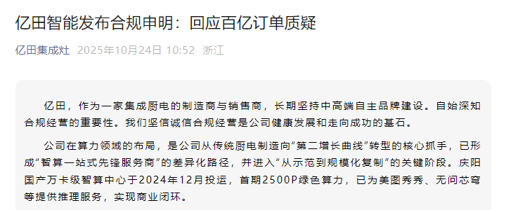根据声明内容,亿田智能正积极推动从传统厨电制造向“第二增长曲线”的战略转型,算力领域成为其重点布局方向。公司表示,目前已形成“智算一站式先锋服务商”的差异化发展路径,并进入“从示范到规模化复制”的关键阶段。其中,庆阳国产万卡级智算中心已于2024年12月投入运营,首期2500P绿色算力开始为美图秀秀、无问芯穹等企业提供推理服务,初步实现商业闭环。