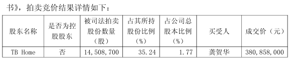 根据公告,公司股东TB Home Limited持有的1450.87万股公司股票,占其自身持股比例的35.24%,占公司总股本的1.77%,在司法拍卖中已竞价成功。网络竞价成功确认书显示,这笔股权的买受人为龚贺华,成交金额高达3.80858亿元。