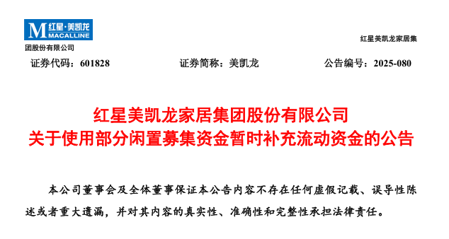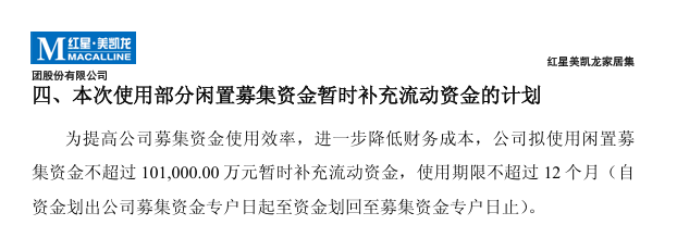10月25日,红星美凯龙家居集团股份有限公司(下称“红星美凯龙”)发布公告,宣布计划使用不超过10.1亿元的闲置募集资金暂时补充流动资金,使用期限不超过12个月。这一决议已审议通过。