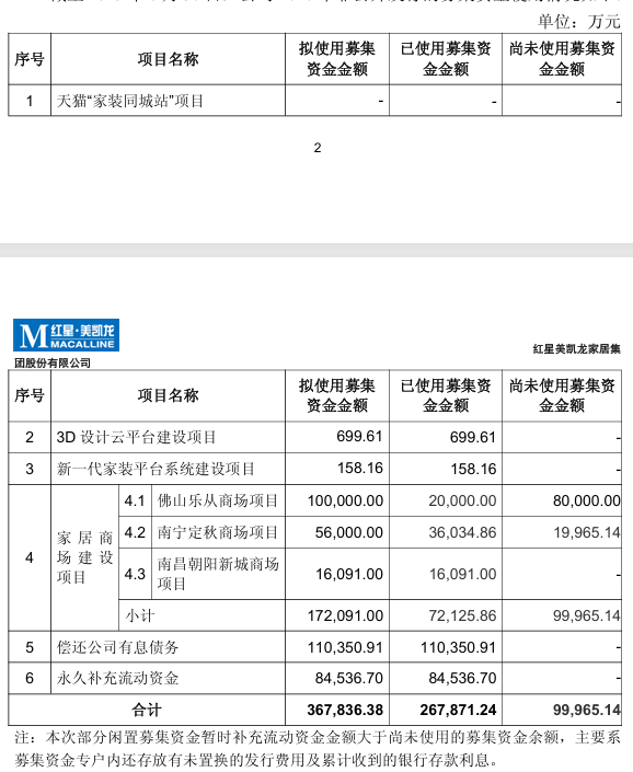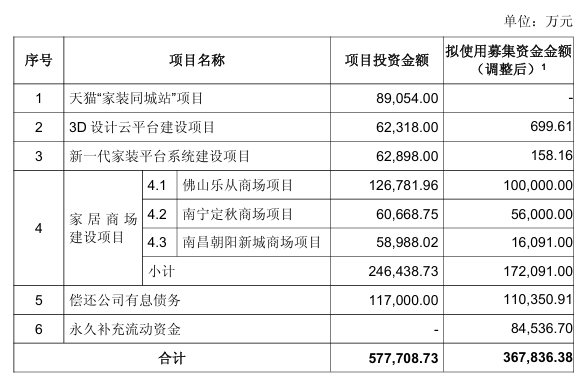 这笔资金来源于公司2021年的非公开发行股票。根据公告,当时公司向特定投资者非公开发行了近4.5亿股股票,募集资金净额达36.78亿元,用于建设天猫“家装同城站”、3D设计云平台、新一代家装平台系统、三大商场等项目,以及偿还公司有息债务、永久补充流动资金。