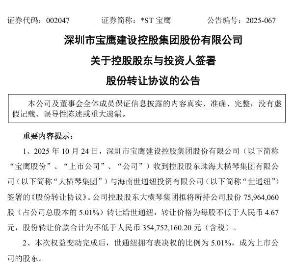 此次控制权变更伴随着一揽子资本运作方案。根据公告,大横琴集团将以不低于4.67元/股的价格,向世通纽转让其持有的宝鹰建设5.01%股份,转让价款不低于3.55亿元(含税)。为确保控制权平稳过渡,大横琴集团及其关联方还承诺放弃持有的剩余22.37%股份对应的表决权。