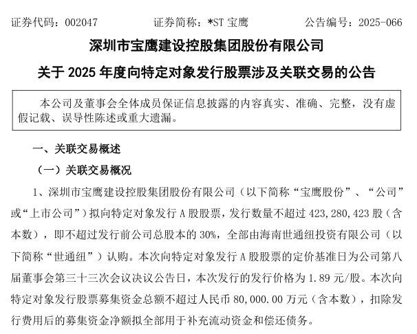 另据公告,宝鹰建设拟向特定对象发行不超过4.23亿股股票,发行价定为1.89元/股,募集资金总额不超过8亿元,全部由新控股股东世通纽以现金方式认购。此次向特定对象发行募集资金扣除发行费用后拟全部用于补充流动资金和偿还债务,有助于优化公司的资本结构,提高抗风险能力,保障公司业务持续发展需求,对公司未来发展具有重要战略意义。