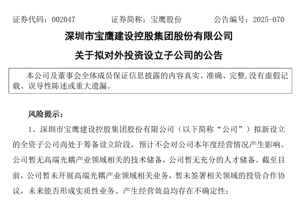 新任控股股东世通纽为此次收购专门设立,其背后的实际控制人傅晓庆、傅相德在产业投资领域积累了一定资源。值得注意的是,宝鹰建设在宣布易主的同时,还披露了向光电半导体产业转型的计划——拟投资3000万元设立全资子公司。此次投资涉及进入高端光耦合器产业领域的相关业务,并计划后续随着光耦合器业务的发展壮大向其他光电半导体领域进军。这一跨界转型若能成功,将帮助宝鹰建设实现从传统建筑装饰向高科技制造业的跃升。