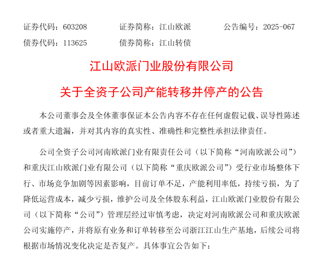 10月28日,江山欧派门业股份有限公司(下称“江山欧派”)发布公告,宣布对旗下两家全资子公司——河南欧派门业有限责任公司和重庆江山欧派门业有限公司实施停产,并将原有业务和订单全部转移至浙江江山生产基地。这一举措折射出当前家居制造企业面临的普遍困境与自救之道。