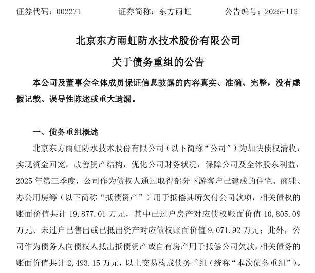 与财报同时披露的,是东方雨虹为改善财务状况而采取的一系列资产盘活措施。公司于第三季度实施了规模近2亿元的债务重组,其中作为债权人通过取得下游客户已建成的住宅、商铺等资产抵偿欠款,相关债权账面价值达19,877.01万元。其中,已过户房产对应债权账面价值10,805.09万元,未过户已售出或已抵出资产对应债权账面价值9,071.92万元。此外,公司作为债务人,向债权人抵出抵债资产或自有房产,用于抵偿公司欠款,相关债务账面价值共计2,493.15万元。本次债务重组中,公司作为债权人的债务重组账面价值占公司最近一期经审计净资产的比例为0.80%,作为债务人的债务重组账面价值占比为0.10%。