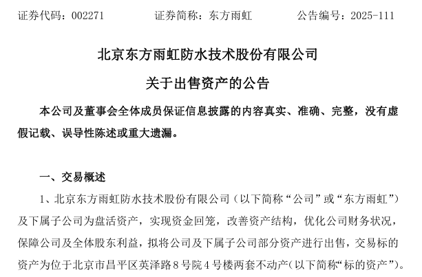 与此同时,东方雨虹加速资产处置步伐。为盘活资产、优化财务结构,公司决定将位于北京市昌平区英泽路8号院的两套不动产出售,预计形成资产处置损失2345.61万元。