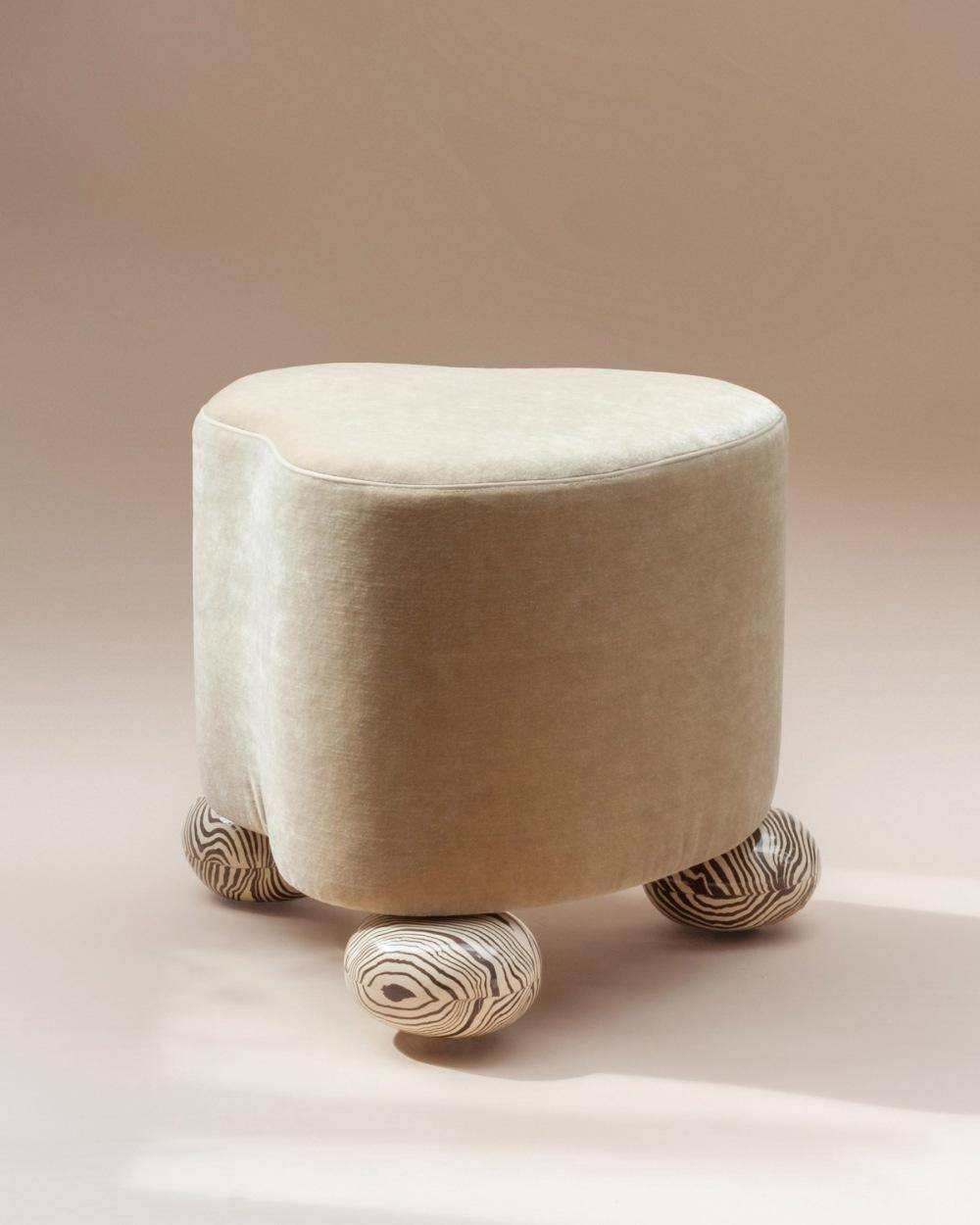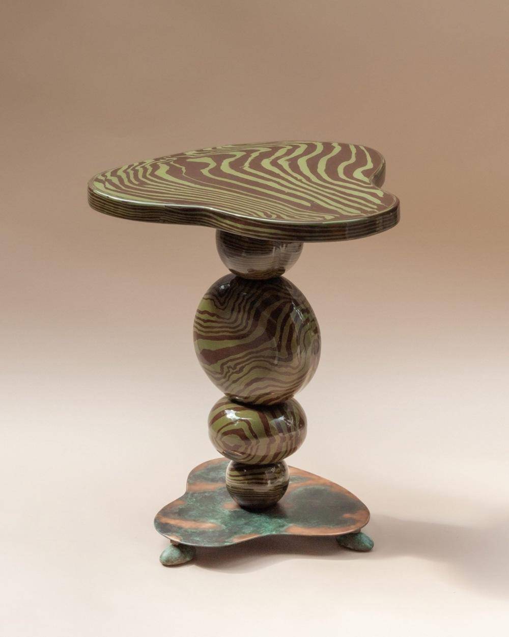 系列中的焦点作品包括Nimbo茶几——配备手工锻造的青铜桌脚、仿古做旧处理的台面与悬浮陶瓷球;以及Cumulus座椅——以青铜结构结合马海毛包覆,配以铸青铜卵石形脚座。Stratus玄关桌则进一步强化了系列的雕塑语汇,以不规则青铜台面搭配扭转的青铜桌脚,并以工作室标志性的“练耳”技法制作的陶瓷球串联其间。