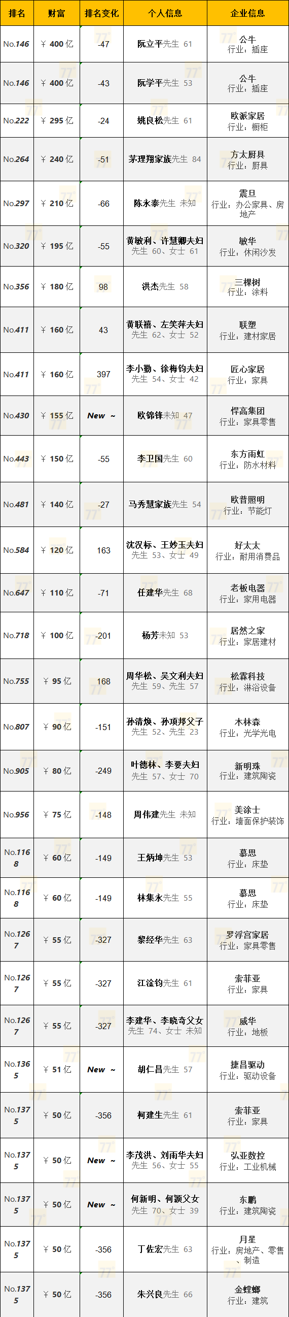 除此之外,上榜的家居大佬还有东方雨虹李卫国(150亿元)、欧普照明马秀慧家族(140亿元)、好太太沈汉标、王妙玉夫妇(120亿元)、老板电器任建华(110亿元)、木林森孙清焕、孙项邦父子(90亿元)、美涂士周伟建(75亿元)、威华地板李建华、李晓奇父女(55亿元)、金螳螂朱兴良(50亿元)。