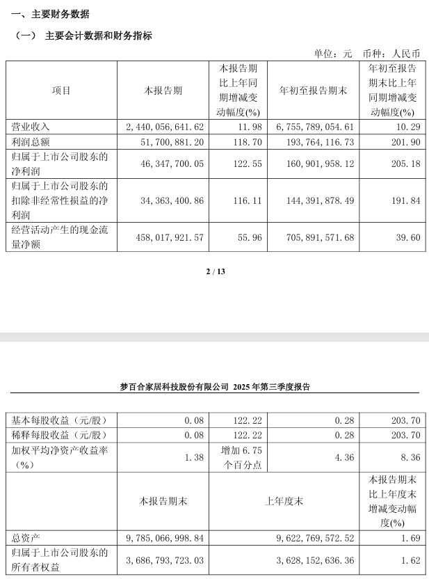 10月29日,梦百合家居科技股份有限公司(下称“梦百合”)发布第三季度报告显示,公司前三季度实现营业收入67.56亿元,同比增长10.29%;归母净利润达1.61亿元,同比大幅增长205.18%。其中第三季度单季实现营收24.40亿元,同比增长11.98%,净利润5170.09万元,同比增长118.7%。