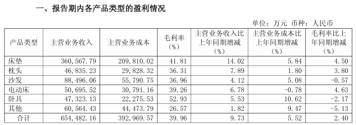 从具体业务数据来看,梦百合各产品线均保持稳定增长态势,其中核心产品床垫表现最为突出,前三季度实现营收36.06亿元,同比增长14.02%,毛利率达41.81%,较上年同期提升4.5个百分点。枕头、电动床等产品毛利率也均有明显提升,分别增长3.8和4.63个百分点。