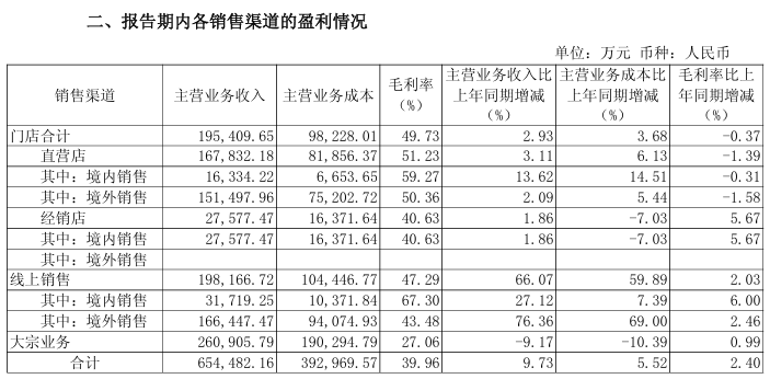 分渠道观察,线上销售成为本报告期最大亮点。前三季度线上渠道实现营收19.82亿元,同比大幅增长66.07%,其中境外线上销售增速尤为迅猛,达到76.36%。线上业务整体毛利率47.29%,较上年同期提升2.03个百分点,境内线上销售毛利率更是高达67.30%。相比之下,传统门店渠道增长平稳,直营店营收增长3.11%,经销店营收微增1.86%,大宗业务则出现9.17%的下滑。