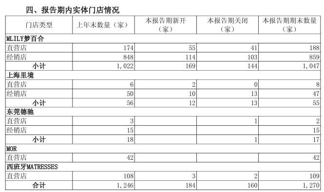 门店网络建设方面,梦百合持续优化渠道布局。截至报告期末,公司实体门店总数达1270家,较上年末净增24家。其中主力品牌MLLIY梦百合门店1047家,本报告期新开169家,关闭144家,在动态调整中实现网络优化。直营门店数量增至188家,显示出公司对渠道控制的加强。
