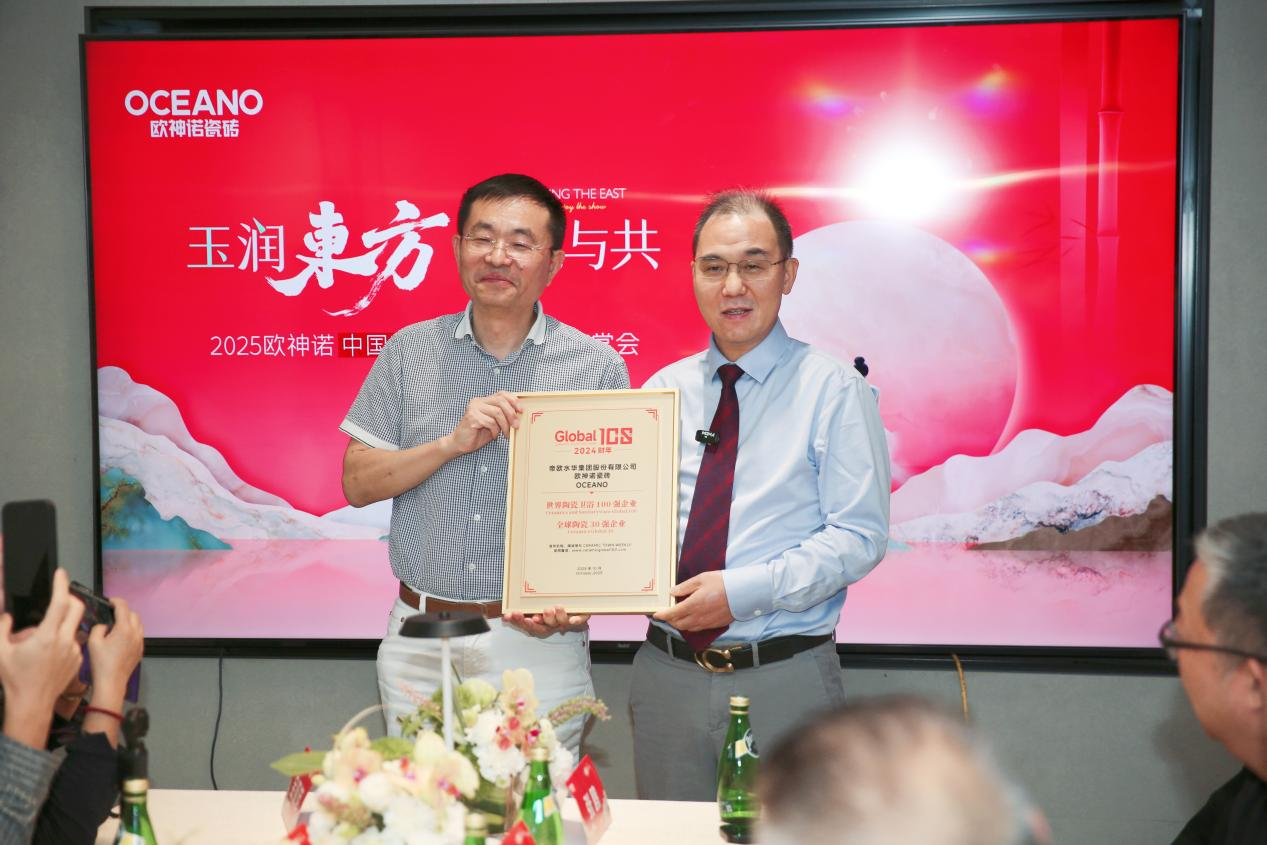 现场特别安排了荣誉授牌环节,由陶城报社长李新良为欧神诺颁发全球瓷砖30强奖牌。在全场媒体朋友们的见证下,这不仅是对欧神诺品牌综合实力的肯定,也将活动现场氛围推至高潮。