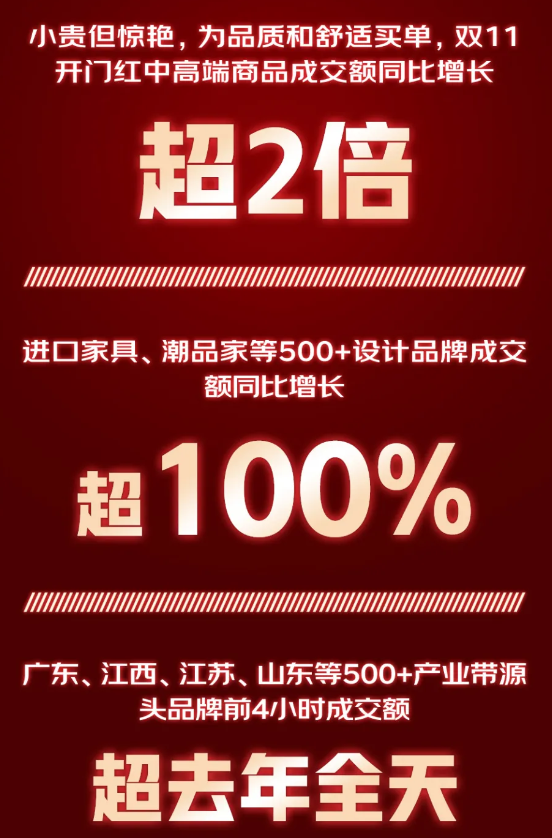 在消费升级趋势推动下,中高端商品表现尤为亮眼,成交额同比增长超过2倍。进口家具、潮品家等超过500个设计品牌成交额也实现翻倍增长。广东、江西、江苏、山东等全国多个产业带的500多家源头品牌,仅用开场4小时就超越了去年全天成交额,显示出源头好货的强大吸引力。