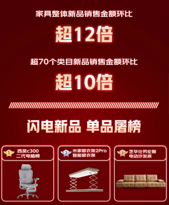 家具新品同样表现抢眼,整体新品销售金额环比增长超12倍,超过70个类目的新品销售额环比增长超10倍。西昊C300二代电脑椅、水家晾衣架2Pro、芝华仕劳伦斯电动沙发床等闪电新品成为热销标杆。