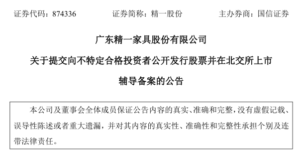 10月31日,广东精一家具股份有限公司(以下简称“精一股份”)发布公告称,公司已与国信证券签署上市辅导协议,并于同日向广东证监局提交了在北交所上市的辅导备案材料。