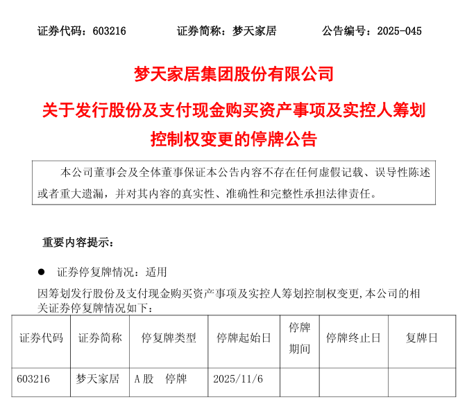 11月5日晚间,梦天家居集团股份有限公司(下称“梦天家居”)的一纸公告,在资本市场投下了一枚“重磅炸弹”。公司宣布,因筹划两大重要事项而自6日起停牌:一是拟通过发行股份及支付现金方式收购芯片企业上海川土微电子股份有限公司(下称“川土微”)的控制权;二是公司实际控制人余静渊正在筹划控制权转让。这两项足以改变公司命运的交易同期推进,瞬间引发了市场关于其“跨界转型”与“易主”的无限遐想。