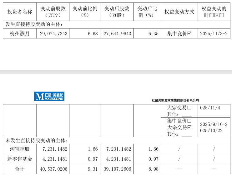 红星美凯龙于11月5日晚间发布公告,披露公司持股5%以上股东杭州灏月企业管理有限公司及其一致行动人近期完成新一轮股份减持,持股比例已由9.31%降至8.98%,触及1%的权益变动披露门槛。