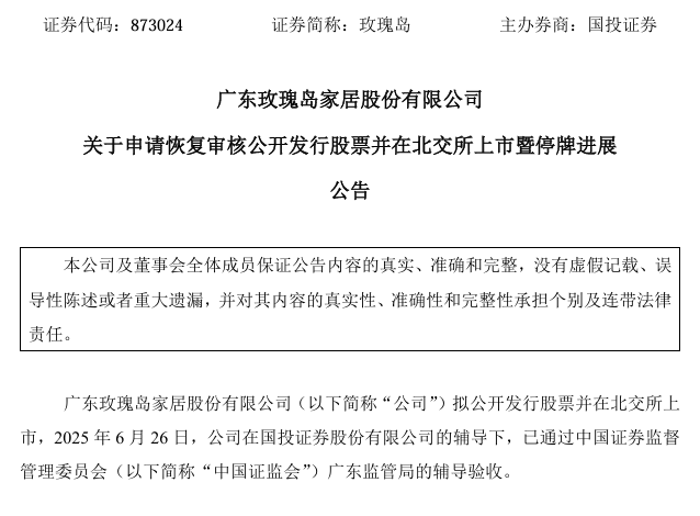 广东玫瑰岛家居股份有限公司(下称“玫瑰岛”)在北交所的上市进程,在经历一个多月的短暂中止后,如今重回正轨。根据公司11月5日发布的公告,因其已完成财务资料更新,北交所已于11月4日将其上市审查状态调整为“恢复审核”。这一关键进展,意味着这家主营淋浴房、浴室柜等产品的全卫定制企业,其IPO之旅进入了新的阶段。