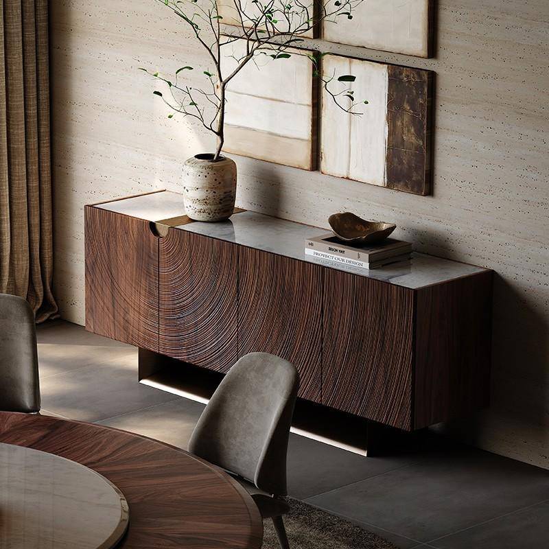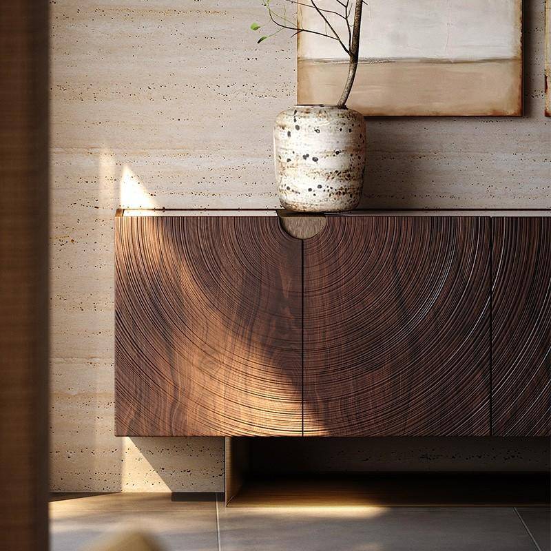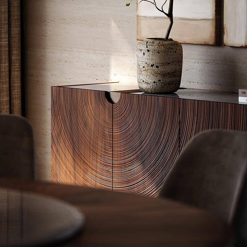 在材质选择上,VISN突破常规,选用常用于船舶制造的海洋板作为基材,其卓越的防潮性与结构稳定性,为产品赋予了如舰船般坚固的内核。而柜门所使用的北美黑胡桃木实木,厚度经精密测算,既保留了天然木纹的肌理感,又有效规避了开裂与变形的风险,在艺术表现与实用功能之间取得完美平衡。