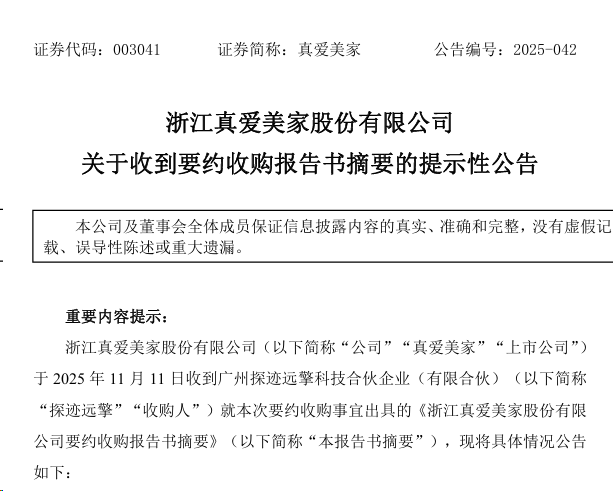 11月11日晚间,浙江真爱美家股份有限公司(简称:真爱美家)发布一系列公告,宣告公司控制权即将发生实质性转移。公司控股股东真爱集团有限公司与广州探迹远擎科技合伙企业(有限合伙)已达成一揽子交易协议,新晋控股股东探迹远擎将以总计近12亿元的代价,拿下公司近45%的表决权,公司实际控制人将变更为黎展。此举标志着这家主营家居纺织品的上市公司即将迎来全新的发展阶段。