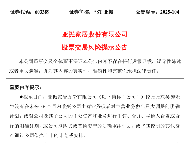 11月11日,亚振家居发布一则股票交易风险提示公告,称公司控股股东吴涛目前没有在未来36个月内改变公司主营业务或对主营业务做出重大调整的明确计划,也没有资产重组、借壳上市等相关安排。这一声明试图回应市场近期对公司可能被“借壳”的强烈预期,但似乎并未能抑制资金的热情。
