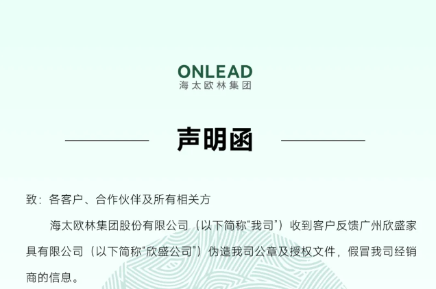 11月12日,海太欧林集团股份有限公司发布一则郑重声明,揭露广州欣盛家具有限公司涉嫌伪造公章、授权文件等材料,假冒其授权经销商进行商业活动。这一事件引发业内对商业信誉与市场规范的广泛关注。