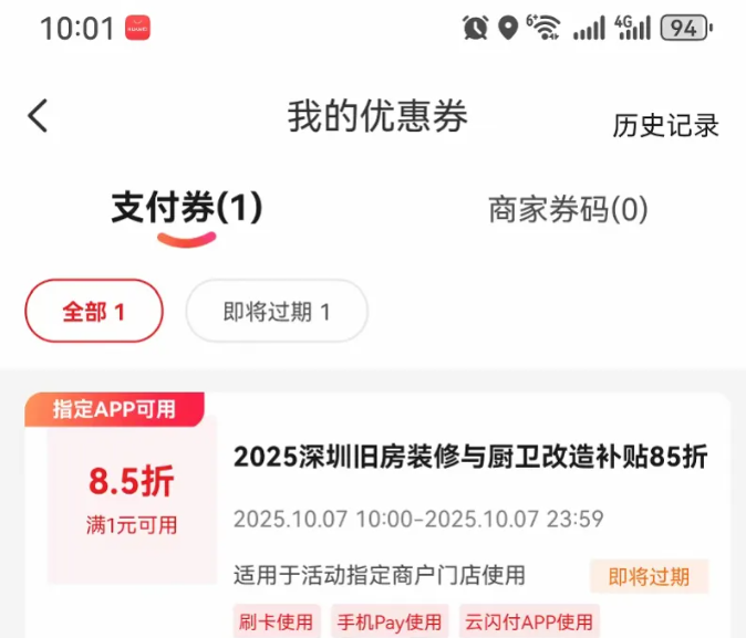 今年国庆期间,市民抢到的8.5折家装补贴券。