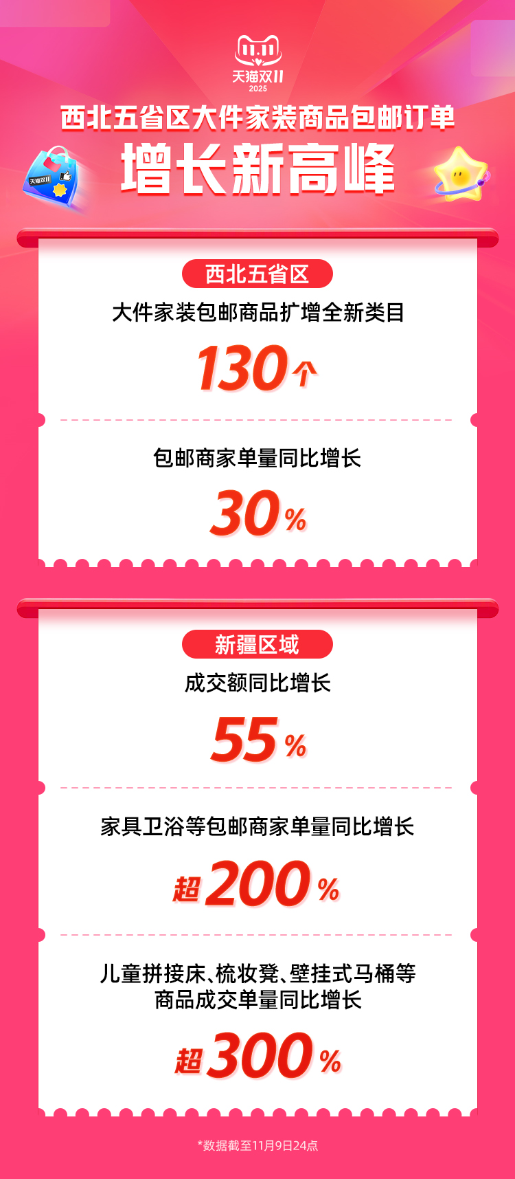 平台数据显示,截至11月9日24时,甘青宁内蒙新疆5个省区包邮商家单量同比增长30%。其中,新疆区域成交额同比增长55%,家具卫浴等包邮商家订单量同比增长超200%,63个商品类目成交单量翻倍,儿童拼接床、梳妆凳、壁挂式马桶等商品成交单量同比增长300%以上。