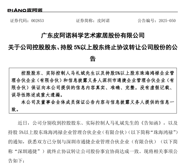 11月17日,广东皮阿诺科学艺术家居股份有限公司(简称:皮阿诺)发布公告,宣布公司控股股东、实际控制人马礼斌先生及持股5%以上股东珠海鸿禄企业管理合伙企业(有限合伙)与深圳市通捷企业管理合伙企业(有限合伙)已协商一致,终止于2024年12月签署的股份转让协议。