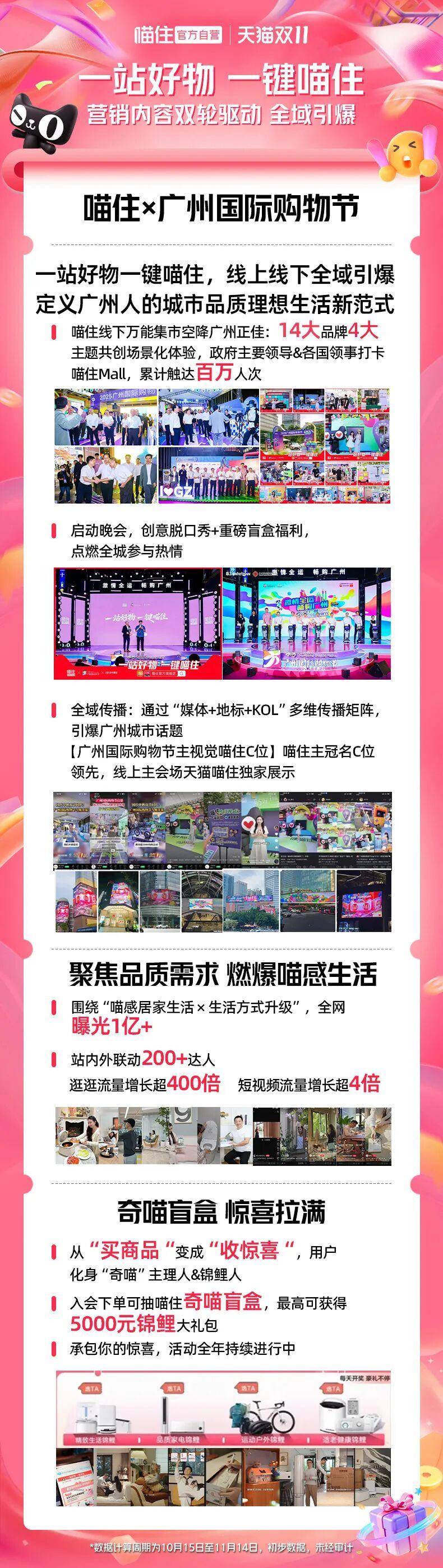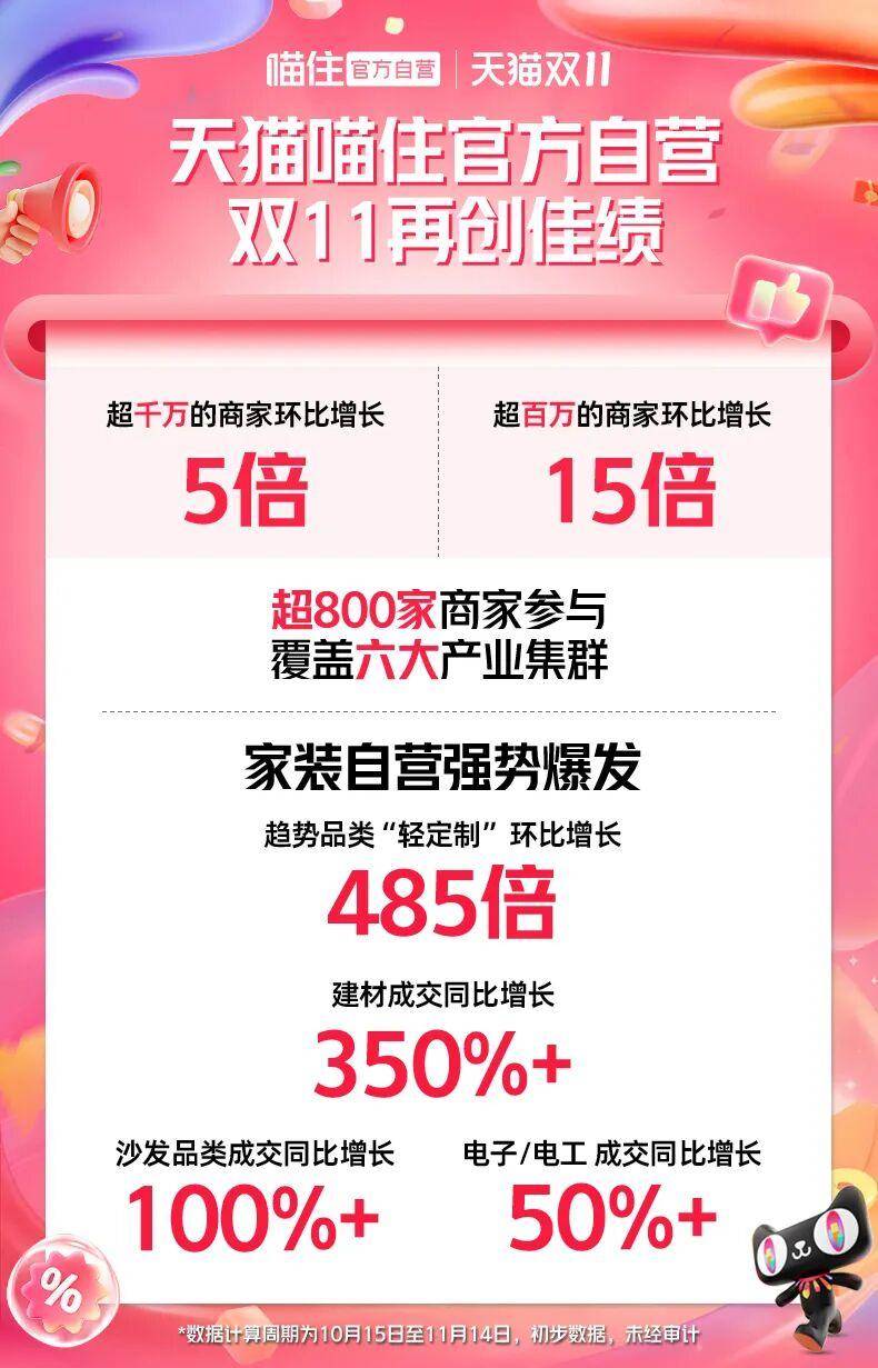 平台自营业务“天猫喵住”在今年双11表现尤为亮眼。数据显示,其建材品类成交额同比增长超过350%,趋势品类“轻定制”环比增长高达485倍,沙发品类也实现100%以上的增长。超800家商家覆盖六大产业集群,涵盖家装、家电、家居、运动、适老等多品类,为用户提供一站式购物体验。在营销层面,通过“媒体+地标+KOL”多维传播矩阵构建全域引流体系,同时创新推出“奇喵盲盒”互动机制,将购物体验从单纯的商品交易升级为惊喜收获,有效提升了用户参与度和粘性。
