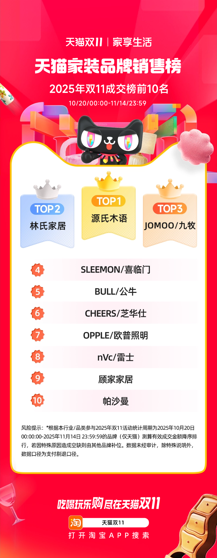 天猫家装双11全周期榜单:源氏木语登顶,林氏、九牧位列前三