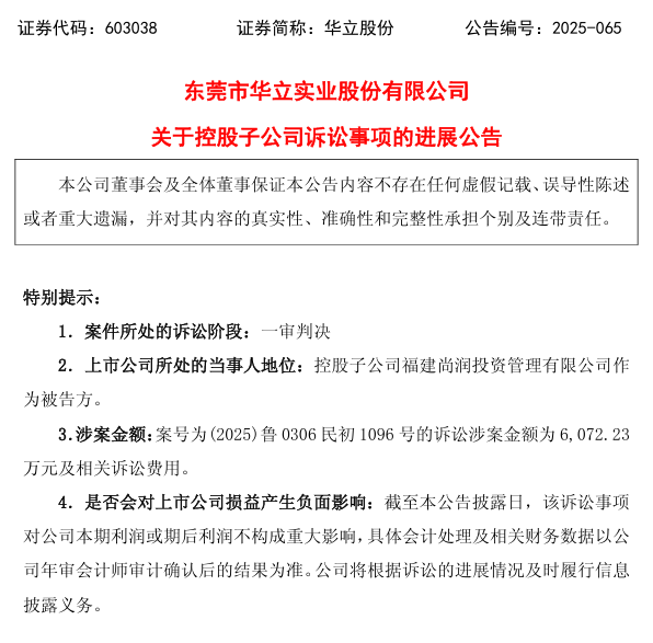 11月17日,华立股份发布一则关于其控股子公司诉讼进展的公告,披露其控股子公司福建尚润投资管理有限公司作为被告,在一桩合伙合同纠纷案中被一审判决需承担连带清偿责任,涉案金额达6072万元。