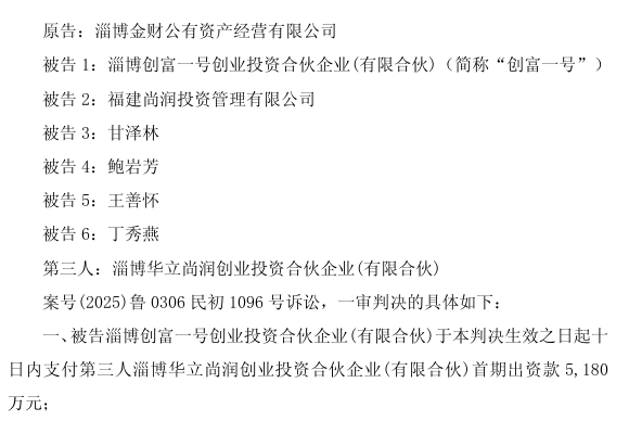 此次迎来进展的为其中案号为(2025)鲁0306民初1096号的案件。根据一审判决结果,被告淄博创富一号创业投资合伙企业需向原告支付首期出资款5180万元,并赔偿相应的利息损失及民事代理费15万元,而华立股份的控股子公司尚润投资则需对上述债务承担连带清偿责任。