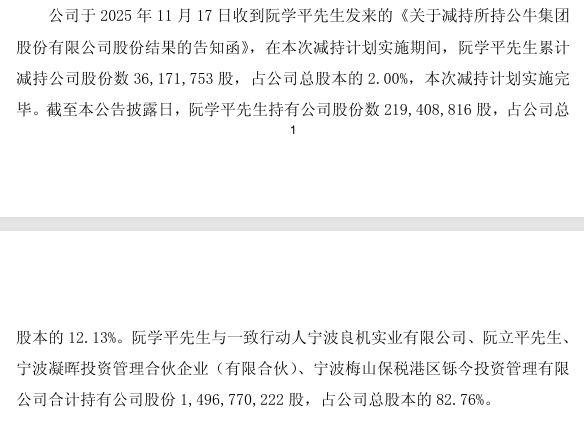 这已是阮学平近年的第二次大规模套现。早在2023年7月,他就曾通过大宗交易减持约1779万股,套现约16.26亿元。减持之前,作为公牛集团的共同实际控制人之一,阮学平与其一致行动人合计持有公司股份约15.33亿股,占公司总股本的84.76%,处于绝对控股地位。本次减持后,该一致行动团体持股比例下降至82.76%。