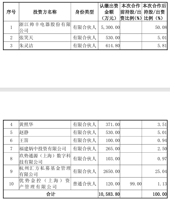 帅丰电器表示,此次投资有利于公司把握新兴产业投资机遇,拓展多元投资渠道。公司以认缴出资额为限对合伙企业债务承担责任,风险可控。资金来源为公司自有资金,不会影响公司日常经营所需现金流,对公司财务状况和经营成果不存在重大不利影响。