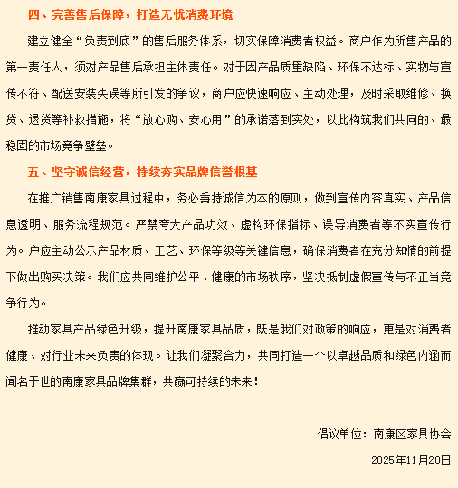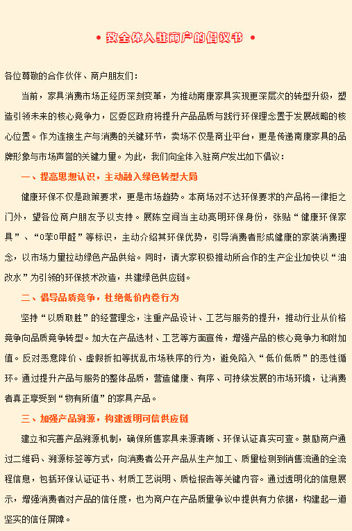 协会在倡议中强调,卖场作为连接生产与消费的关键环节,不仅要发挥商业平台功能,更要承担起传递南康家具品牌形象的重要责任。各卖场被要求通过座谈宣讲、场内公示、一对一沟通等务实形式,将倡议内容精准传达给每一位入驻商户。