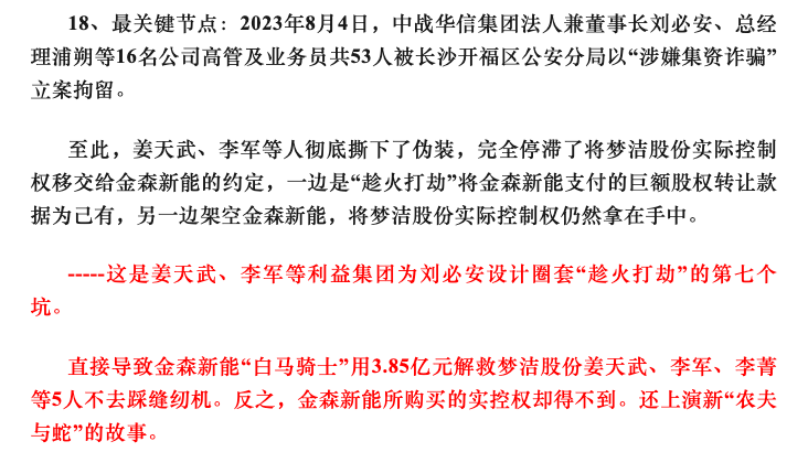 陈洁列举了被举报人的五大核心违法违规手段及事实,直指董事长姜天武、董秘李军等核心高管涉嫌合同诈骗(骗取金森新能3.85亿元股权转让款)、职务侵占(挪用5000万元尽调保证金偿还个人贷款)、操控虚假信息披露(隐瞒股权代持事实、篡改董事会决议等),导致金森新能无法获得梦洁股份实际控制权。同时,陈洁将中战华信集团法人刘必安身陷牢狱、广大投资者利益受损的后果公之于众。
