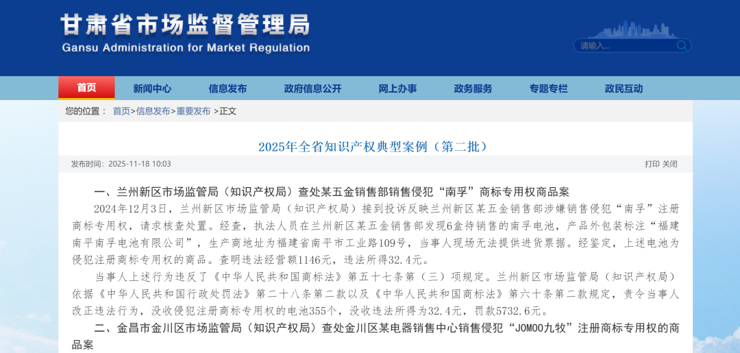 据甘肃省市场监督管理局网站通报的七宗典型案例中,包含金昌市金川区市场监管局(知识产权局)查处金川区某电器销售中心销售侵犯“JOMOO九牧”注册商标专用权的商品案。