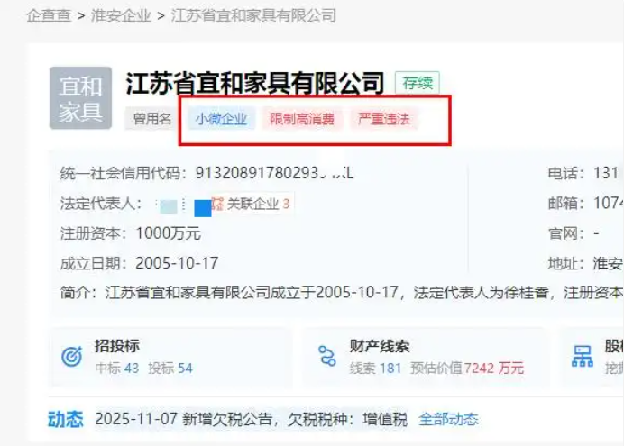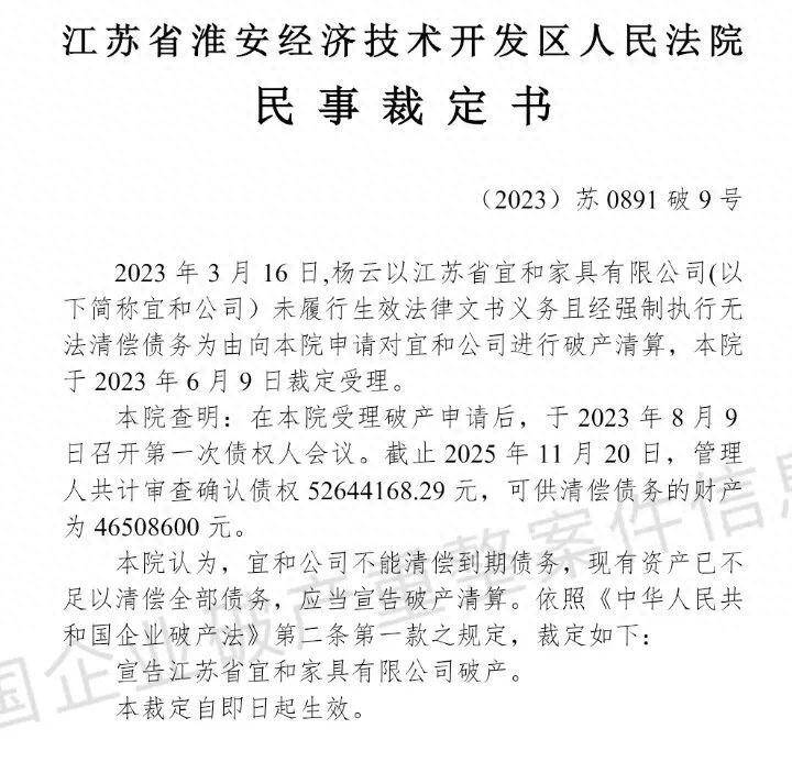 11月20日,江苏省淮安经济技术开发区人民法院正式裁定宣告江苏省宜和家具有限公司(简称“宜和家具”)破产,这家经营整整二十年的老牌家具企业就此退出市场。根据全国企业破产重整案件信息网公布的公告,宜和家具早在2023年3月就被申请破产清算,历经两年多的资产核查与债务清理程序,最终因严重资不抵债被法院依法宣告破产。