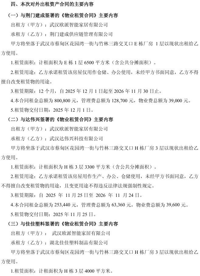 在租赁安排方面,三家公司的租期起始时间略有不同:达伟兴的租期自2025年11月25日开始,荆门建成自2025年12月1日开始,佳佳塑料则自2025年12月25日开始。根据合同约定,租金、管理费及物业费总额分别为:荆门建成合计968,500元,达伟兴合计356,400元,佳佳塑料合计432,000元。