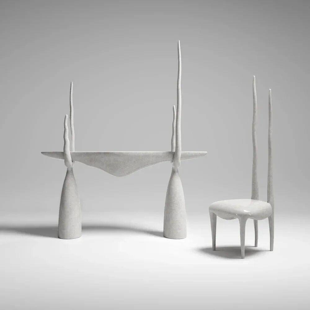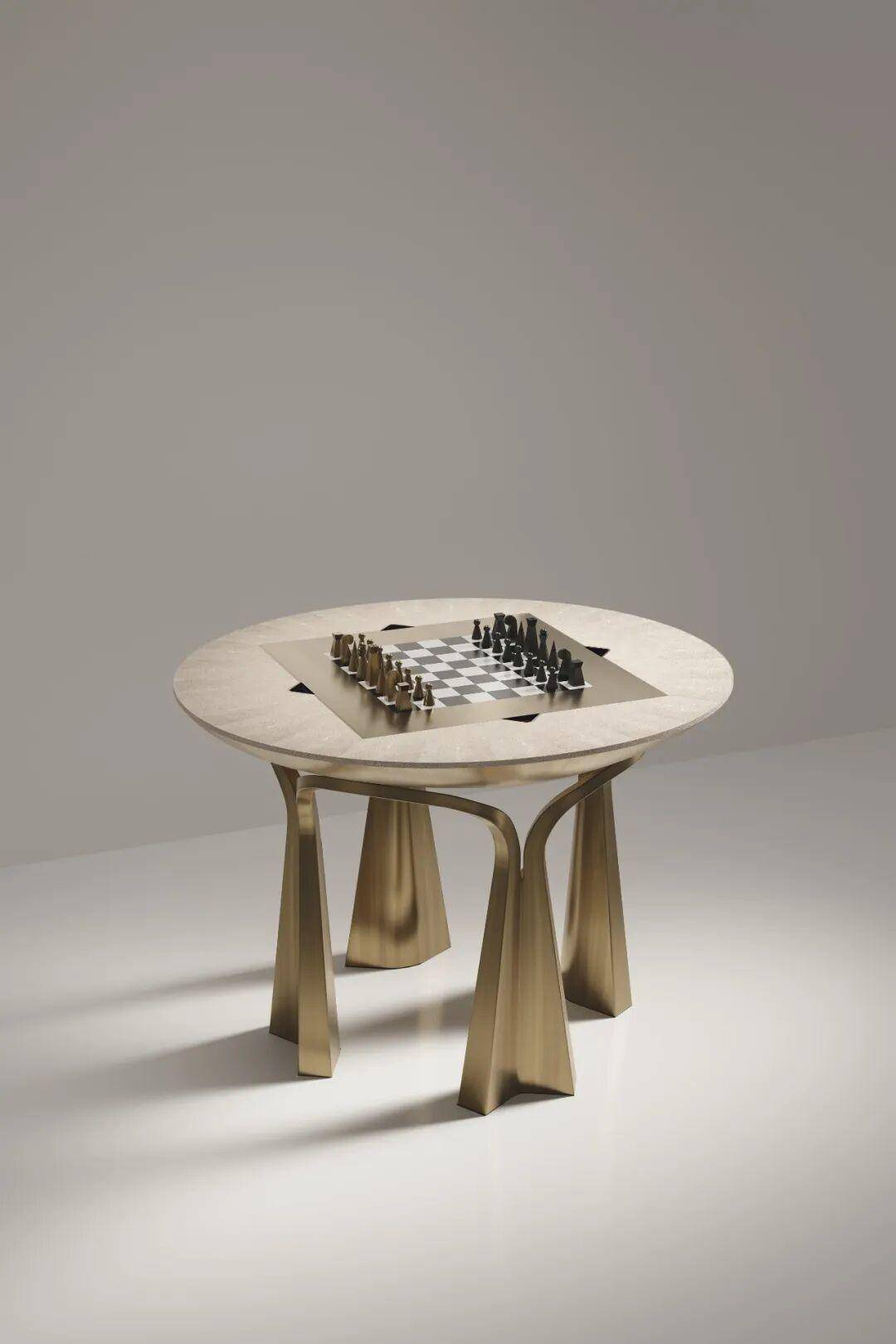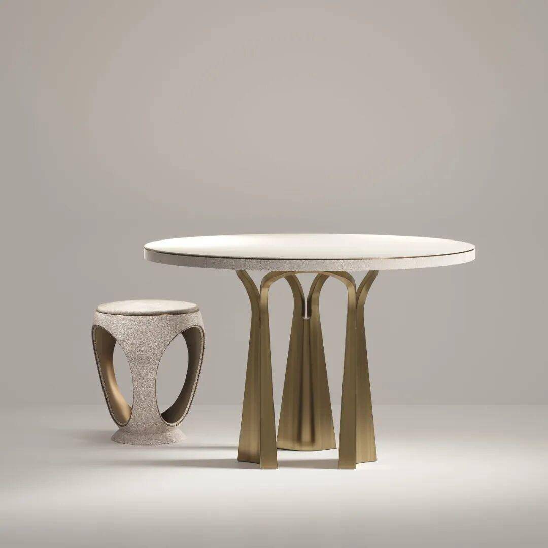 Arche Breakfast Table通过“圆桌+艺术凳”的组合诠释品牌的“奢华日常”理念。圆桌台面以珍珠灰沙革或贝壳材料包裹,黄铜桌腿呈优雅的弧形展开;配套的艺术凳采用镂空设计,既减轻视觉重量,又暗藏艺术巧思。