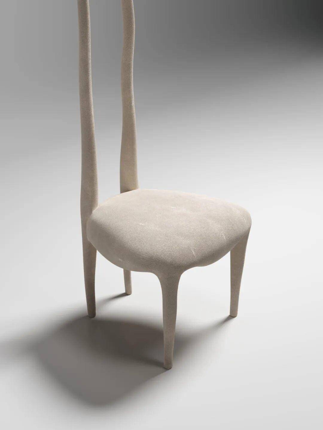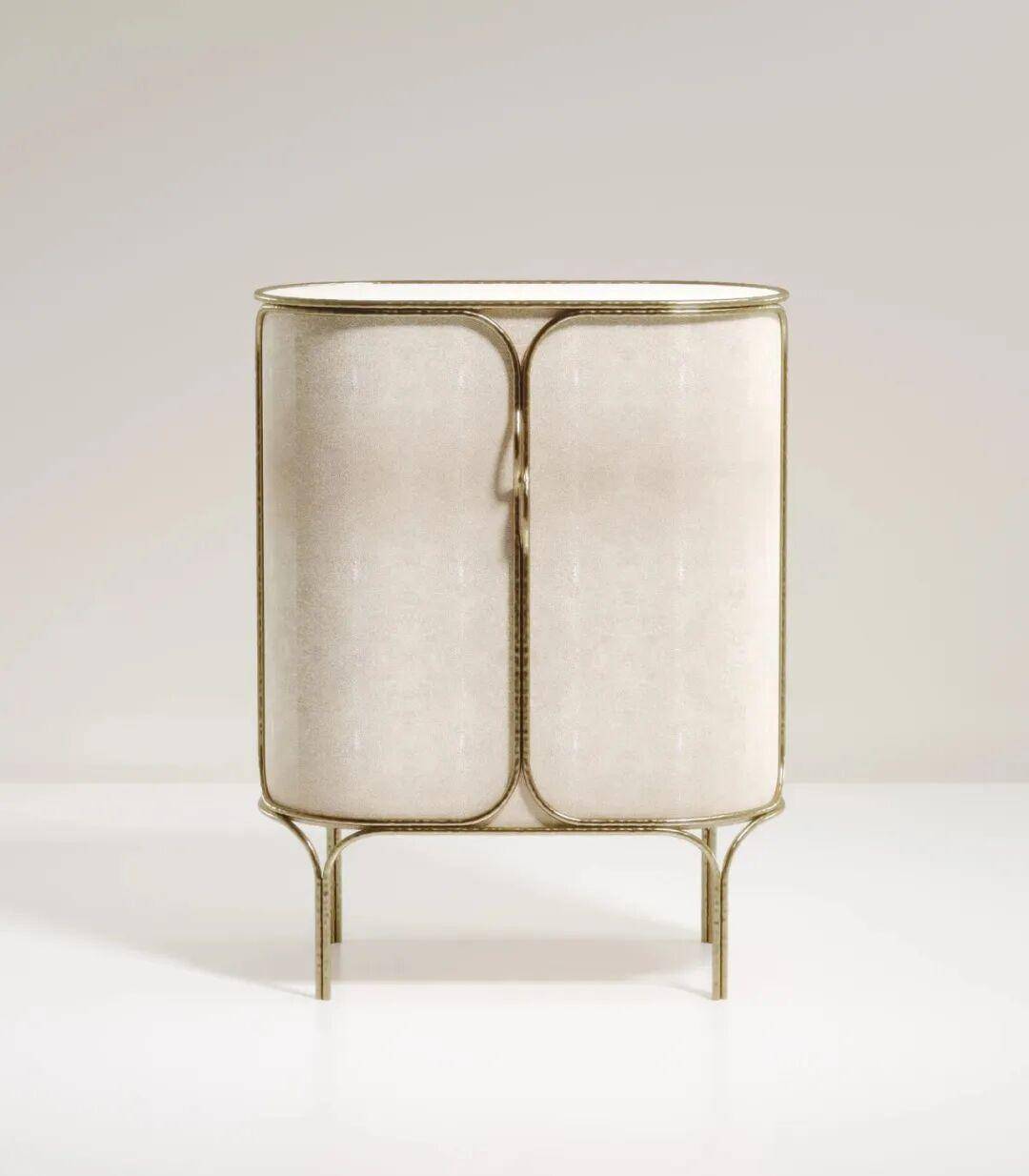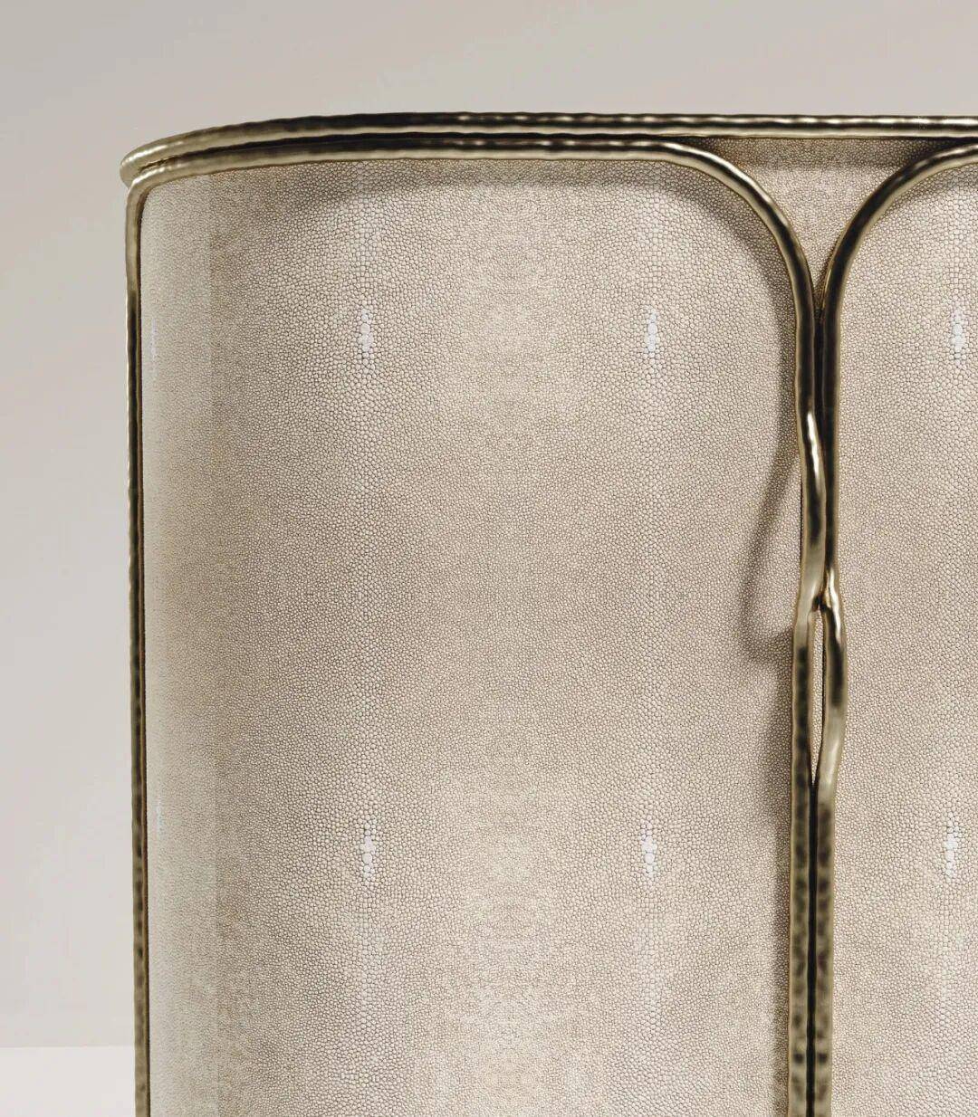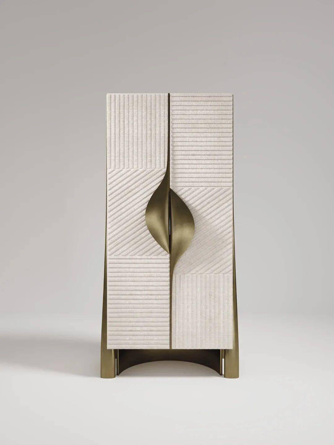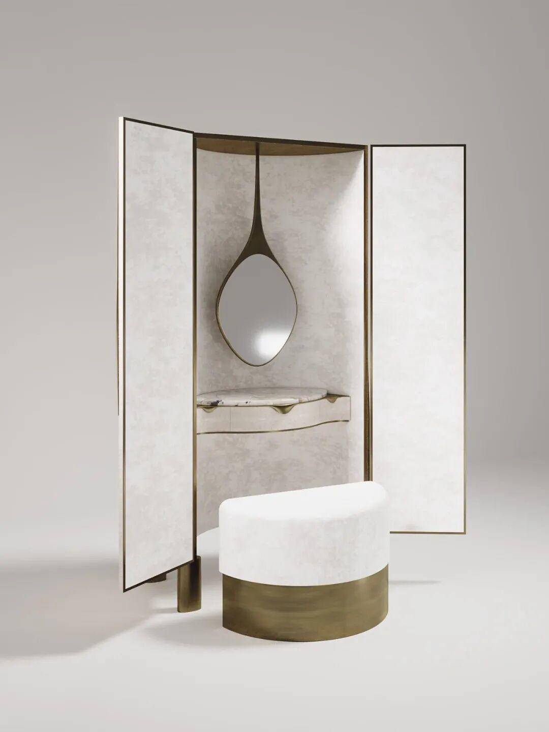 Wave Vanity Cabinet梳妆台以珍珠灰肌理饰面与黄铜框架打造出私密的梳妆空间。水滴形镜子如同艺术挂饰,大理石台面兼顾收纳与美学,搭配鲨鱼皮与黄铜制成的圆凳,让日常梳妆变为一场奢华仪式。
