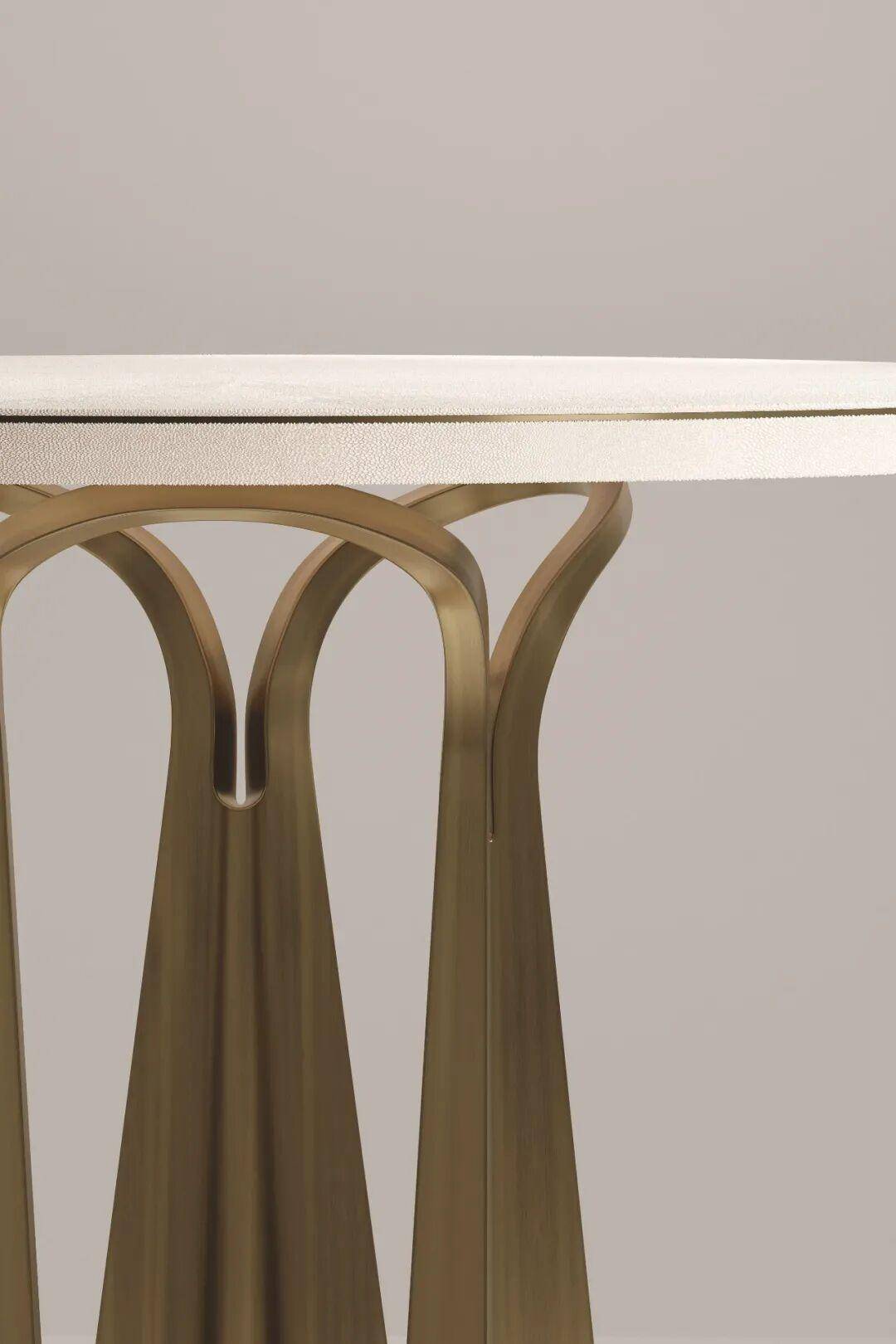 Calla Lily Side Table以“三叶草”为灵感,三片珍珠灰鲨鱼皮台面如花瓣般舒展,黄铜环形底座则成为“花茎”的艺术化表达。其小巧尺寸与独特材质,使其在不同风格空间中都能成为点睛之笔。