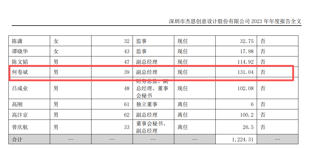 杰恩设计副总经理何卷斌离职,去年薪酬腰斩至65万元