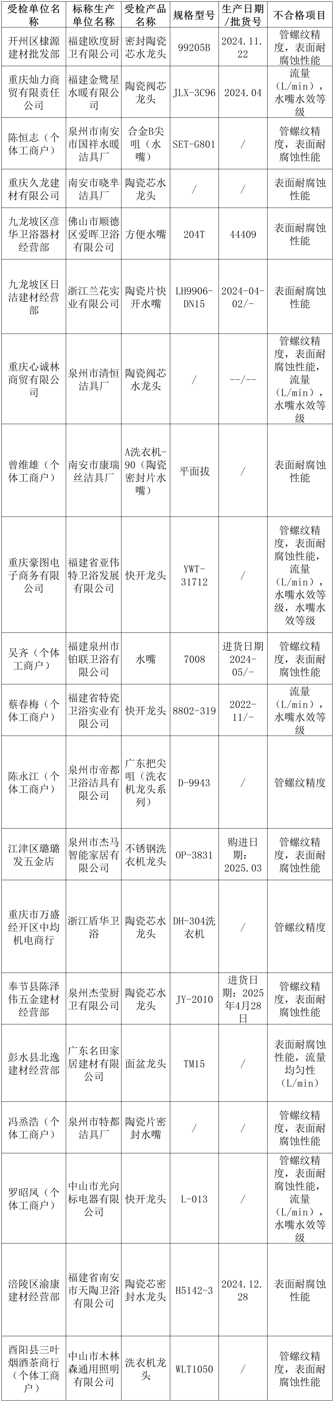 在本次系列抽查中,重庆市市场监督管理局于11月20日公布的抽查情况尤为突出。其针对陶瓷片密封水嘴的检验中,共有20批次产品被判定为不合格,主要问题集中在管螺纹精度、表面耐腐蚀性能、流量、流量均匀性和水嘴水效等级等关键指标。这些问题直接关系到产品的使用寿命、节水效果和使用体验。