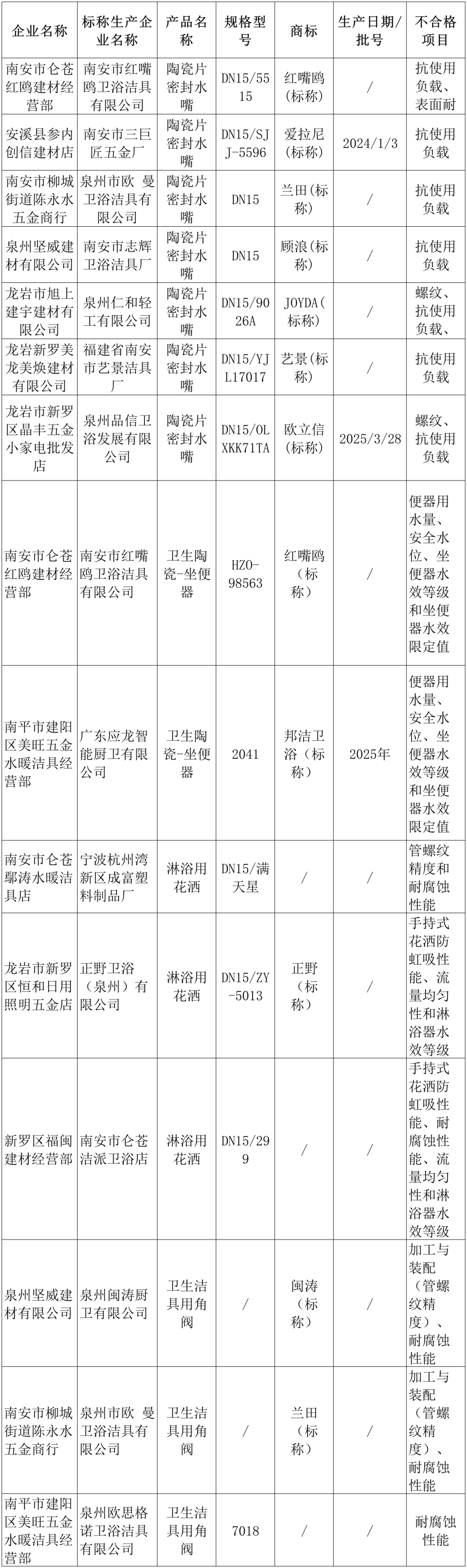 福建省的流通领域抽查同样反映出严峻的质量形势。根据11月13日公布的抽检结果,该省在对57家销售企业120批次水暖卫浴产品的省级监督抽查中,发现15批次产品不合格,整体合格率为87.5%,不合格产品涉及水嘴、花洒、坐便器、角阀等多种常用品类。