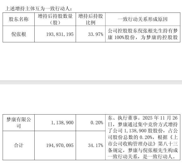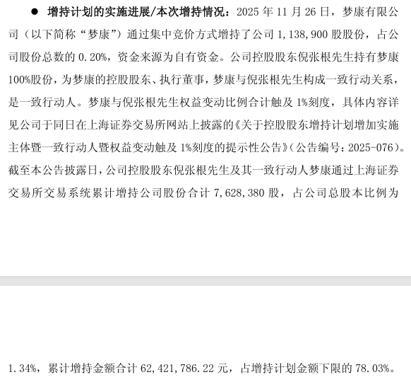 本次增持计划始于2024年2月8日,原定于2025年2月7日到期。2025年2月,倪张根将增持计划履行期限延长12个月至2026年2月7日,并将增持主体调整为倪张根及其一致行动人。2025年11月26日,梦康有限公司通过集中竞价方式增持1,138,900股,占公司总股本0.20%,此举使得倪张根及其一致行动人合计权益变动比例触及1%刻度。