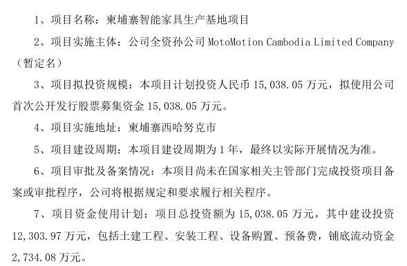 根据公告,匠心家居将通过在香港设立全资子公司“MotoMotion International Holdings Limited”作为投资路径,最终在柬埔寨设立全资孙公司“MotoMotion Cambodia Limited Company”实施该项目。项目建设周期为1年,计划形成年产20万套智能电动沙发、10万套智能电动床和20万套智能电动沙发/床配件的生产能力。